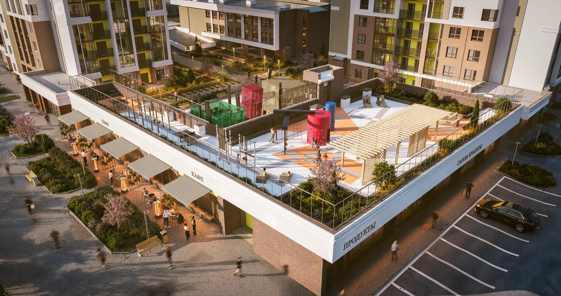 Закрытый многоуровневый благоустроенный двор площадью 6649,69 кв.м. Из них 665,3 кв.м. - это детская площадка и площадка для занятий физкультурой. Все это расположено на эксплуатируемой кровле. Площадь озеленения составит 1 628,69 кв.м.